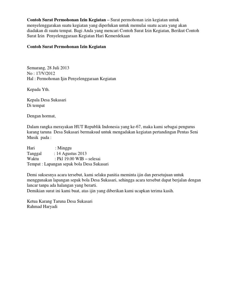 Membuat surat izin harus sesuai dengan kebenaran yang terjadi dan. Terkait surat izin dari dokter akan saya berikan esok hari. Sebagai seseorang yang hidup bersama di dalam sebuah masyarakat tentu akan dihadapkan pada berbagai masalah yang melibatkan individu dengan orang lain. Adapun contoh dari surat permohon izin adalah seperti misalnya anda meminta izin untuk menjadi seorang pembicara dalam suatu seminar maupun juga membuat surat permohonan izin dengan tujuan untuk meminta mutasi atau pindah tugas di tempat dimana anda sedang bekerja saat ini. Pengurus karang taruna rw 10 dan juga panitia acara memohon izin dan persetujuan untuk menggunakan lapangan serba guna rw 10.